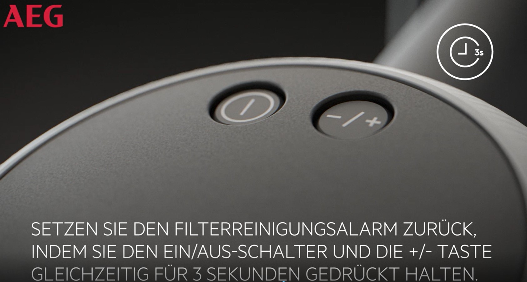 Setze den Filterreinigungsalarm zurück, indem du den EIN/AUS Schalter und die +/- Taste gleichzeitig für 3 Sekunden gedrückt hältst.
